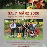 Überzeugt war auch die Jury des renommierten Volksmusikpreises „Zwieseler Fink“ und deshalb wurde den Quergeigern 2024 dieser älteste Volkstumswanderpreis in Bayern verliehen. Dieser wird an diesem Abend auch zu bewundern sein. Ab 19.00 Uhr ist Einlass und fürs leibliche Wohl ist nicht nur mit Wein wieder bestens gesorgt. Eintritt: 10,- €, kein Vorverkauf, nur Abendkasse.