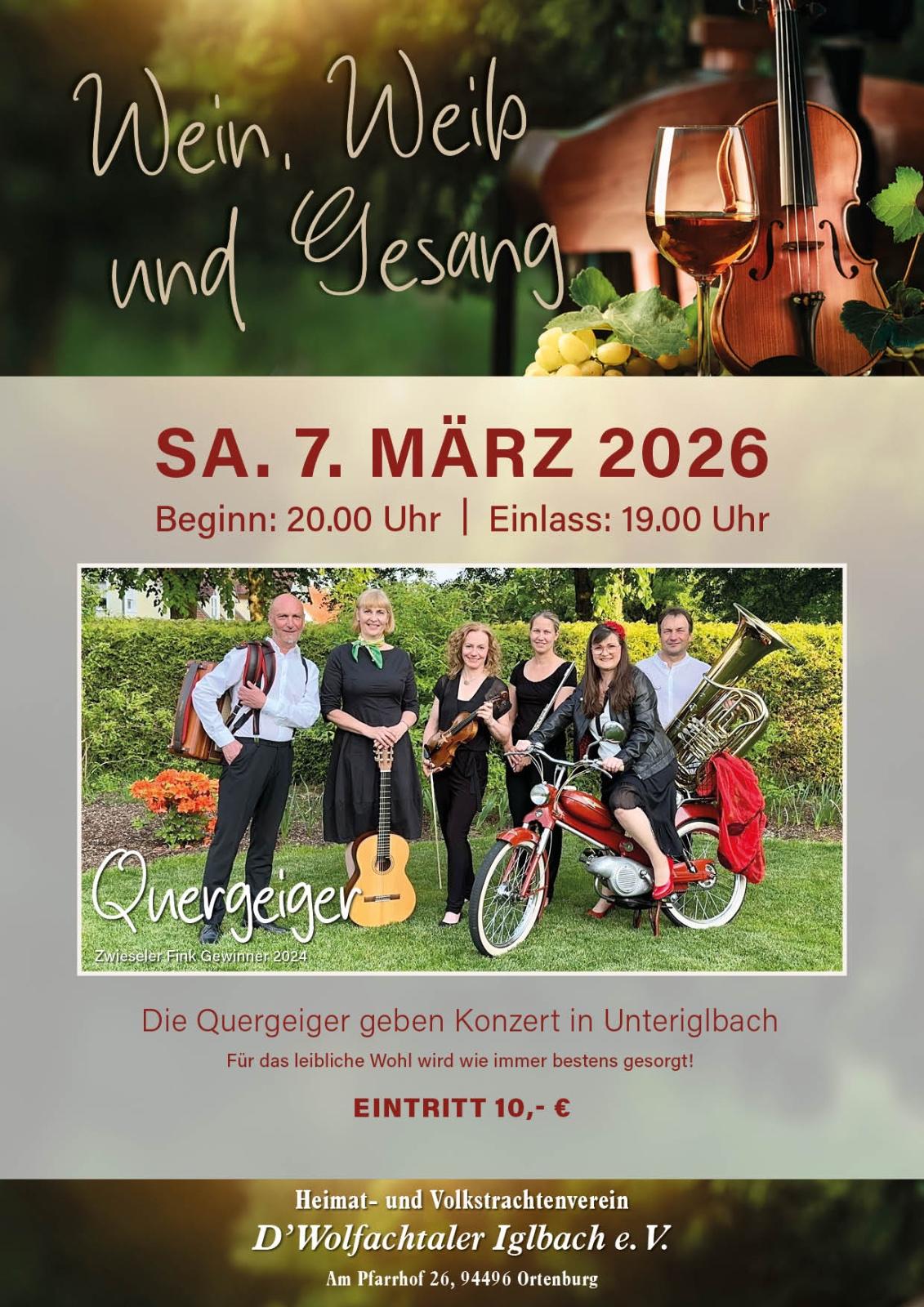 Unter diesem Motto: „Wein, Weib und Gesang“ lässt sich das kleine, aber feine Salonorchester, die Quergeiger, am Samstag, 7.3.2026 ab 20.00 Uhr im Vereinsheim des Heimat- und Trachtenvereins D`Wolfachtaler hören.